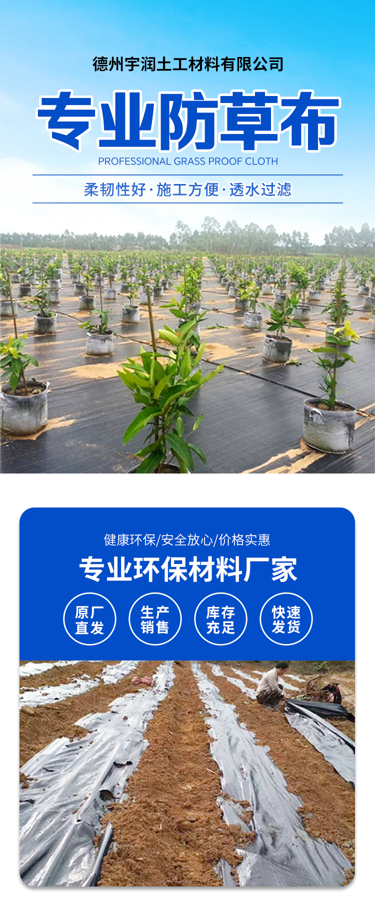 农用防草布的具体规格和功能需求可能因作物种类、地形条件和气候差异而异。德州宇润土工提供定制服务,可以根据客户要求调整布料宽度、厚度、密度以及色彩,确保产品更贴合实际应用场景。无论是大型果园还是小型家庭园艺,都能找到合适的解决方案。