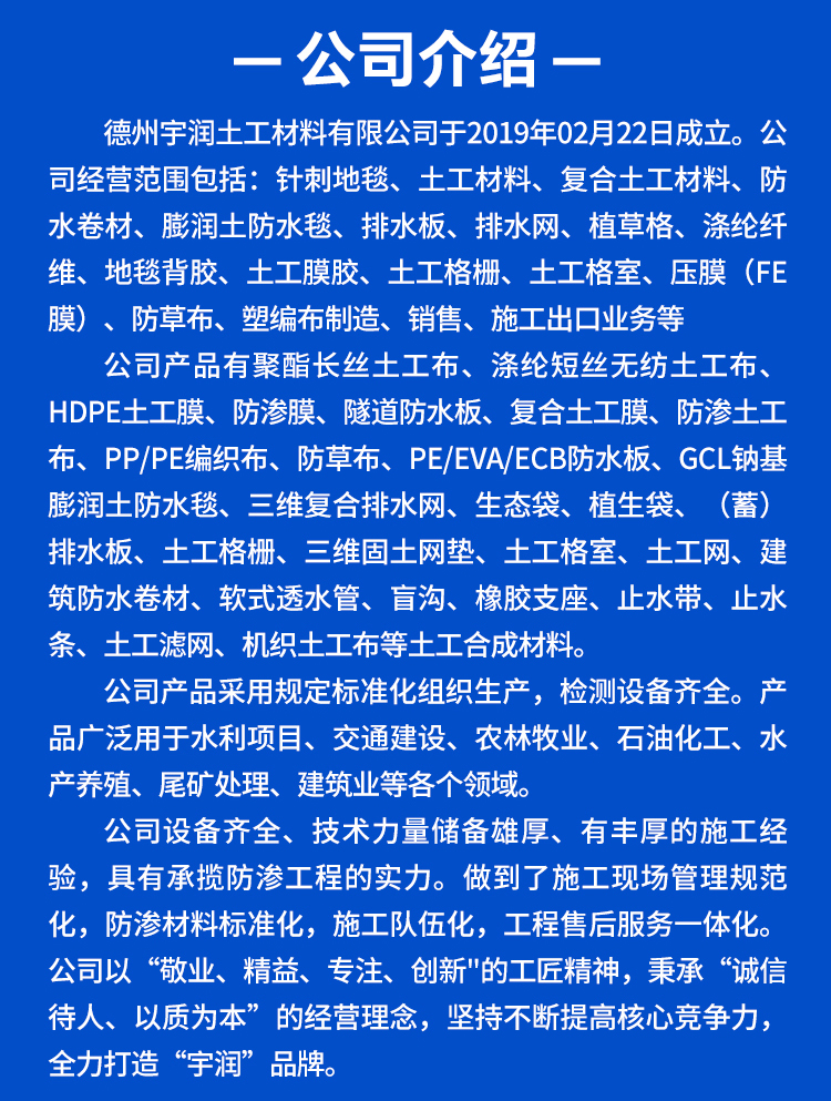 | 主营产品 | 土工膜,土工布,长丝土工布,复合土工膜,防草布,防水板,防渗膜等 | ||